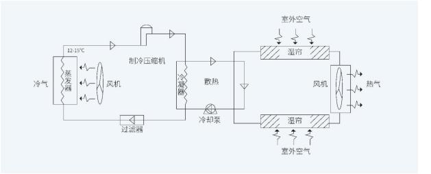 工业节能空调内机中常温冷媒经过膨胀阀节流后变成低温低压的冷媒,输送至内机上半部分的蒸发器,空气经蒸发器变成冷空气到出风口 。产生的高温媒介经过换热板,将热量传导给循环水,高温循环水由外机采用湿帘蒸发式冷凝技术来给循环水降温,水温降至常温后再输向内机的热交换板。内机冷媒被降温后,再次进入压缩机。这样不断循环运作,将能效比发挥到最大的同时,源源不断的产生冷气。